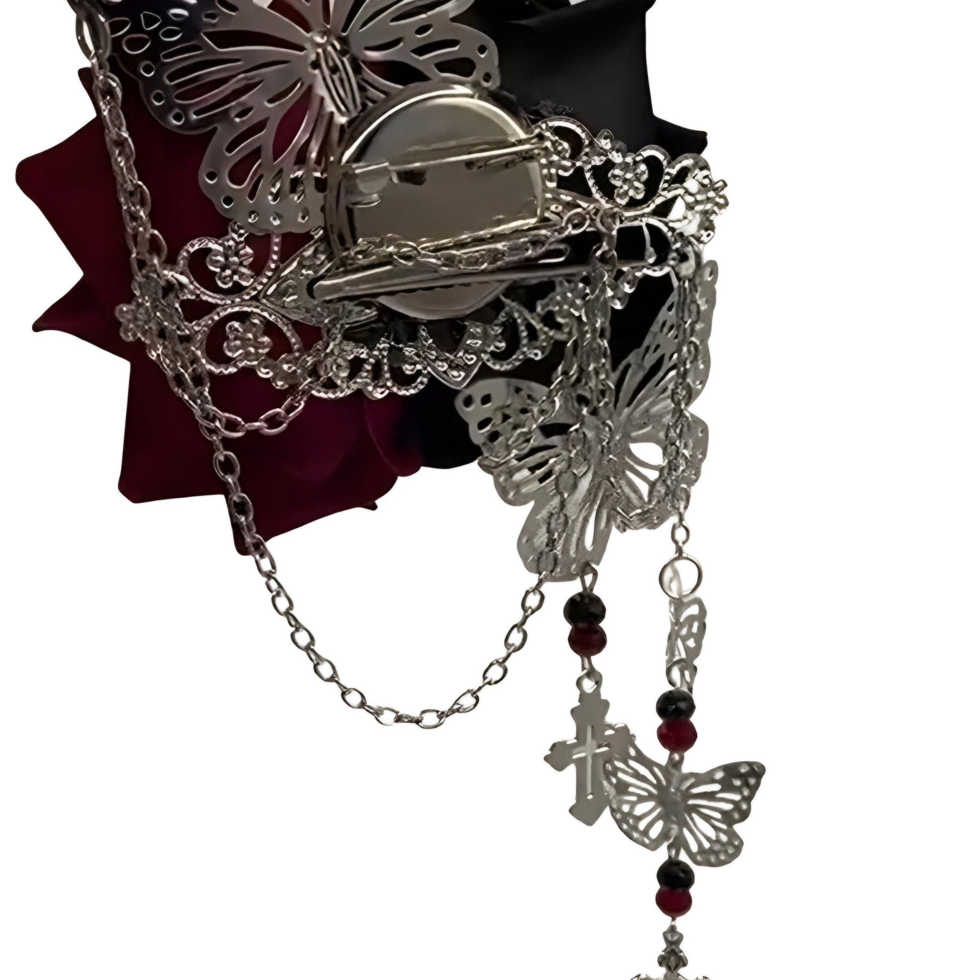 This gothic accessory features a stunning black and red rose with intricate butterfly detail that adds a touch of whimsical charm, making it a perfect addition to your Gothic or Lolita ensemble.